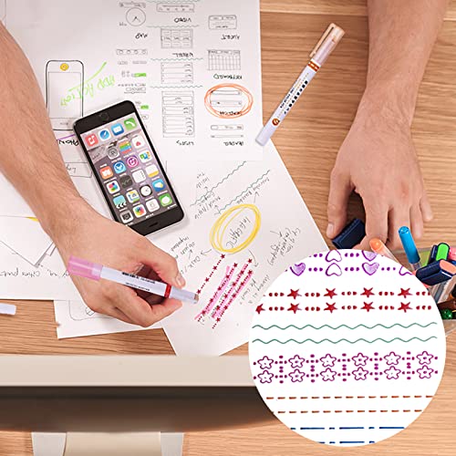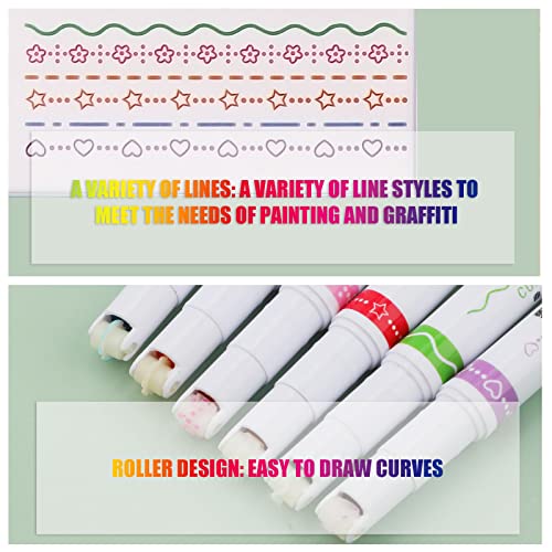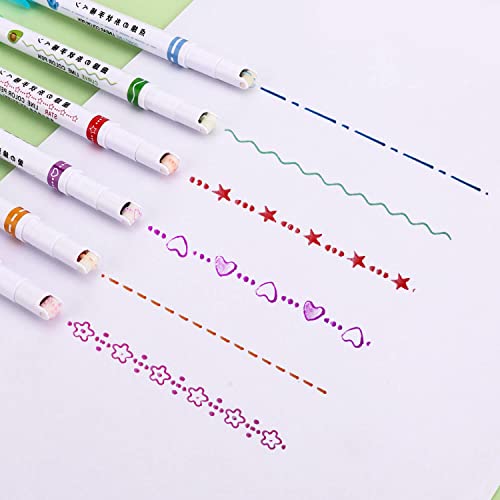 Pakketinhoud: u ontvangt 6 stukken gekleurde curve markeerstiften in 6 tekenstijlen, inclusief golvende lijn, bloemlijn, stippellijn, sterrenlijn, stippellijn en liefdeshartlijn, voldoende om aan uw verschillende schrijf- en tekenbehoeften te voldoen.