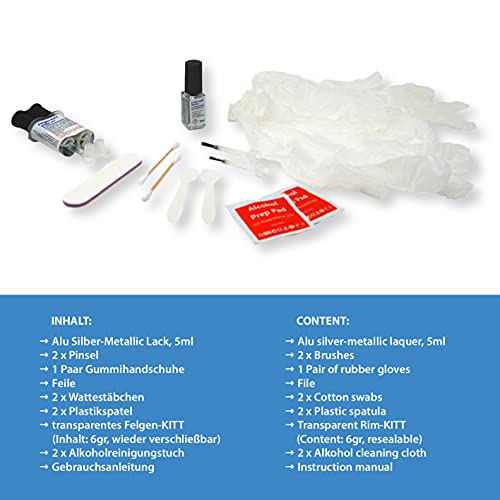 De verf kun je na succesvolle velgreparatie met onze lak – zilverlak metallic aanbrengen. Bij de levering bevindt zich de velg metallic lak. Inhoud: 1x zilver metallic lak, handschoenen, spatel, alcoholreiniger, vijl, kwast, wattenstaafjes, gedetailleerde meertalige gebruiksaanwijzing, doorzichtige velgenkit.
