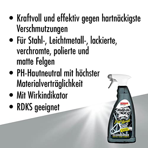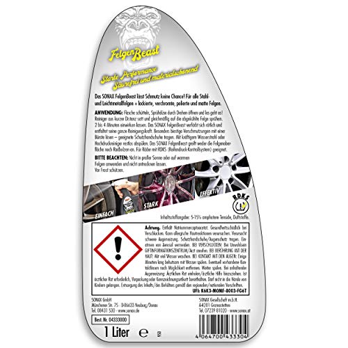 Specification: SONAX VelgenBeast (1 liter) verwijdert zelfs buigzame verontreinigingen op alle gepolijste, verchroomde en matte stalen en lichtmetalen velgen. Art-Nr. 04333000