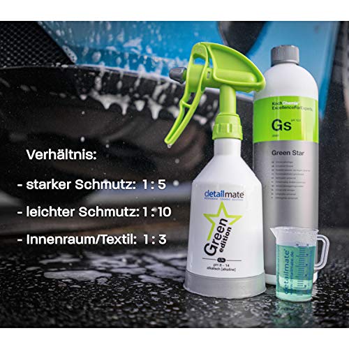 Specification: detailmate Green Star set voor het reinigen van het interieur van de auto: Koch Chemie GreenStar universele reiniger van 1l, KWAZAR Mercury spuitfles Green Edition van 0,5 l, geschikt voor pH 8-14, met 2 microvezeldoeken en een Valet Pro borstel.