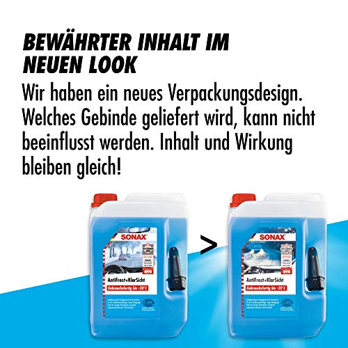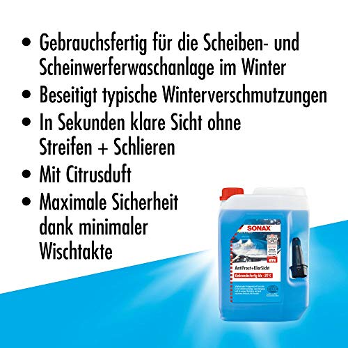 Sonax AntiFrost&KlarSicht gebruiksklaar tot -20 °C (5 liter) is een snelle, streepvrije en effectieve ruitenreiniger voor de winter, art.nr. 03325000